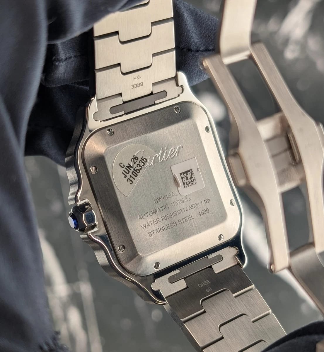 Contenu de la livraison : Double boîte, montre, livrets, carte de garantie, outil de bracelet, bracelet en cuir gris avec boucle déployante