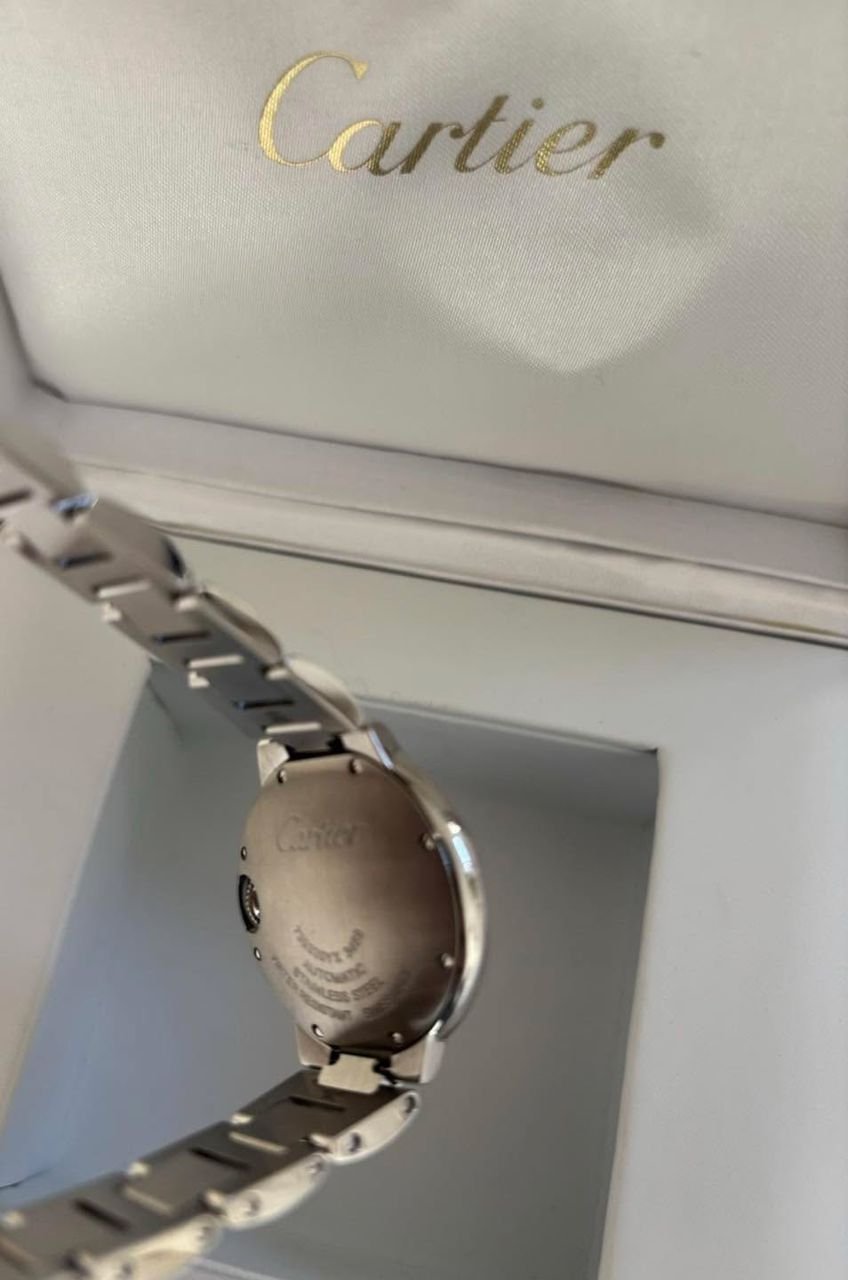Montre Ballon Bleu de Cartier, 33 mm, mouvement mécanique à remontage automatique. Boîtier en acier, couronne cannelée sertie d’un spinelle synthétique cabochon, cadran rose, chiffres romains, aiguilles en forme de glaive en acier bleui, glace saphir, bracelet en acier. Dimensions du boîtier : diamètre : 33 mm, épaisseur : 9,96 mm. Étanche jusqu’à 3 bars (environ 30 mètres). Flottant comme un ballon, aussi bleue que le cabochon qu’il renferme, la montre Ballon Bleu de Cartier apporte une touche d’élégance aux poignets masculins et féminins. Les chiffres romains sont guidés par un mécanisme de remontage bleu profond. Les courbes convexes du boîtier, le cadran guilloché, les aiguilles en forme de glaive et les maillons polis ou satinés du bracelet assurent à la montre Ballon Bleu de Cartier une place de choix dans l’univers horloger de Cartier.
