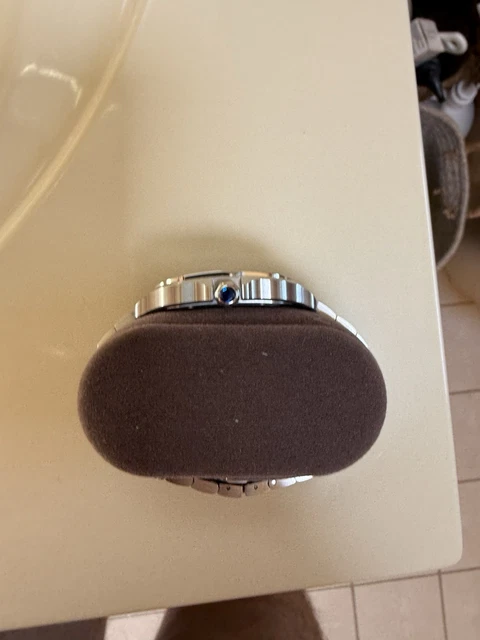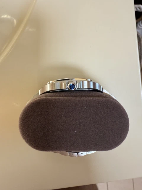 Comme neuf. Aucune rayure, tourbillon, bosse, etc. Portée une douzaine de fois. Conservée dans un écrin à l’abri de la poussière. Ensemble complet. Bracelet en cuir supplémentaire, interchangeable à la main. Parfait état.