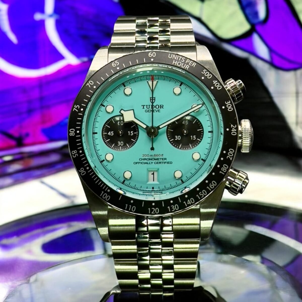 Montre Tudor Black Bay Chrono SE 79360N, cadran bleu flamant rose, 41 mm, acier, ensemble complet