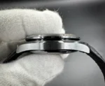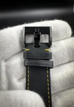 Présentée sur un bracelet en cuir noir perforé avec un intérieur en caoutchouc jaune, la montre est entièrement en céramique noire et comprend des aiguilles de chronographe jaunes vernies et une échelle tachymétrique Super-LumiNova.