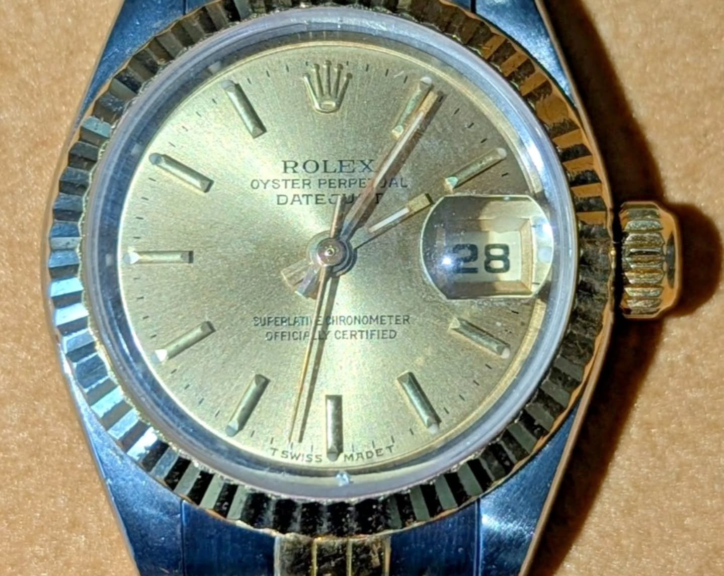 Le cristal présentait quelques éclats sur le bord, à midi et à 18 heures. J’ai utilisé des limes diamantées pour éliminer la plupart des éclats. Je voulais conserver le cristal, qui, je crois (mais sans en être certain), est l’original. Cependant, le bord est légèrement arrondi (voir photos). C’est difficile à voir en utilisation normale, mais c’est bien là.
